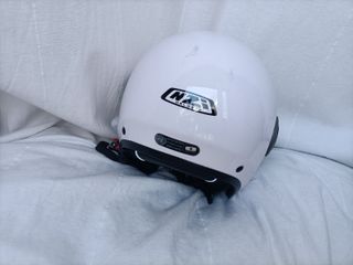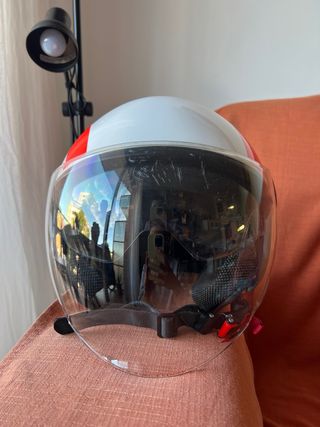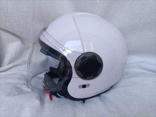 Casco jet NZI en talla S, color blanco. Ideal para trayectos urbanos. - Visera transparente y gafas de sol. - Cierre de seguridad tipo click - Interior cómodo. Muy poco uso, está prácticamente nuevo.