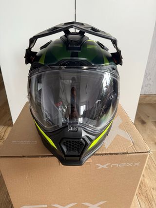 Nuevo Casco moto Nexx X.WED3 con un diseño camuflaje en tonos verdes y detalles en amarillo neón. Perfecto para aventuras. - Diseño camuflaje verde y amarillo. - Visera clara. - Fabricado en Portugal.