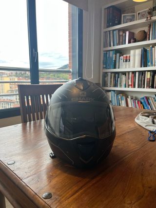 Casco integral Shark Spartan, talla L. Incluye funda. - Color negro brillante. - Visera transparente y visera solar integrada.