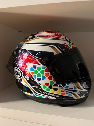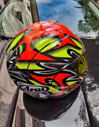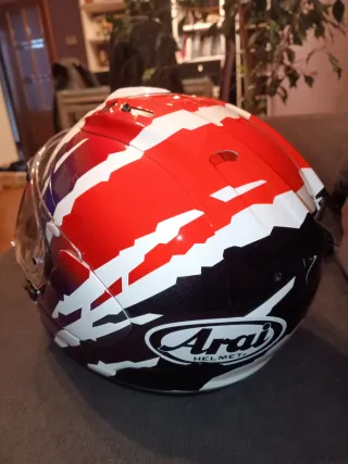 Casco Arai RX7-V EVO Nakagami talla S. Incluye dos pantallas, clara de serie y ahumada. Se ha usado 3 veces. Está como nuevo. También incluye spoiler original de Arai. Se entrega con su funda y caja originales. Solo la pantalla ahumada y el spoiler originales ya valen un pico.