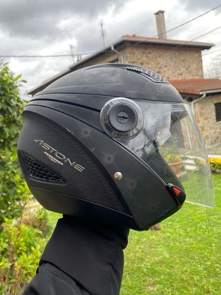 Casco de moto Astone en color negro con visera transparente. - Diseño moderno y funcional. - Interior acolchado para mayor comodidad. - Ventilación superior.