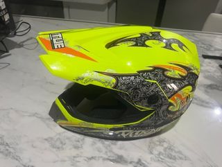 Casco de motocross con un diseño llamativo en negro, amarillo y blanco. - Visera aerodinámica. - Acolchado interior. - Cierre de correa. El cierre está un poco oxidado por eso el precio Talla L