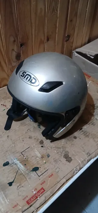 Casco de moto de color plateado, con detalles en negro y logo de la marca SMD. - Diseño abierto. - Correa de sujeción ajustable.
