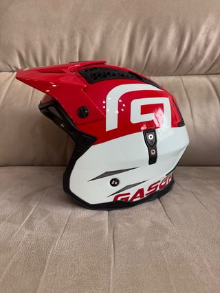 Casco de moto Gas Gas en color rojo y blanco. Muy poco uso, está prácticamente nuevo. Incluye funda de la marca Hebo. - Talla M. - Diseño deportivo. - Rejillas de ventilación.