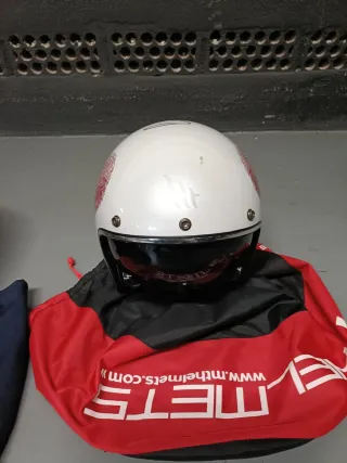 Casco de moto estilo jet, color blanco con detalles gráficos en rojo y plateado. Incluye visera. - Diseño MTH. - Acabado brillante. - Incluye funda de tela. - Es talla S