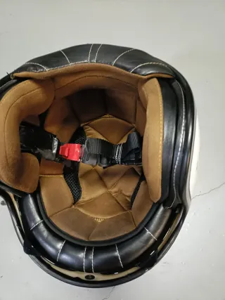 Casco integral para moto con un diseño retro y detalles llamativos. - Acabado brillante en negro con detalles dorados. - Interior con ribetes de cuero. - Visera transparente. - Talla L.