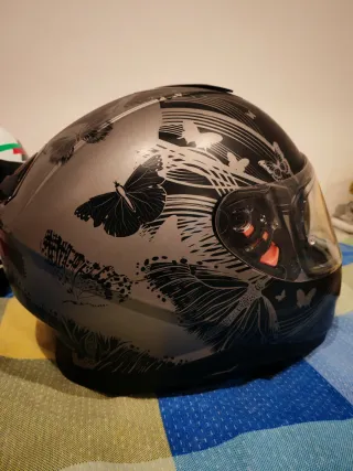Casco de moto con un diseño llamativo de mariposas y detalles florales. - Color base gris plateado. - Diseño en negro y plateado. - Visera transparente. Marca MT Helmet Talla L. Usado en ocasiones contadas no más de 10 usos y trayectos cortos. Doble Visera. Algo negociable, pero poco.