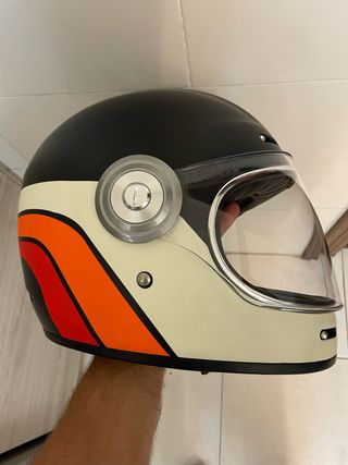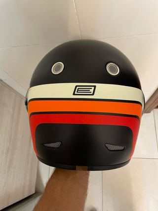 Casco de moto con un diseño retro y vibrante. Perfecto para quienes buscan estilo y protección. - Diseño con franjas en naranja y rojo. - Acabado mate en la parte superior. - Visera transparente. - Detalles metálicos. Marca Origine