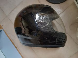 Casco de moto con visera solar integrada y otra visera transparente. Pegada con cola por un lado porque está roto. Y el cuero de color rojo está desgastado. - Color negro brillante. - Diseño moderno.