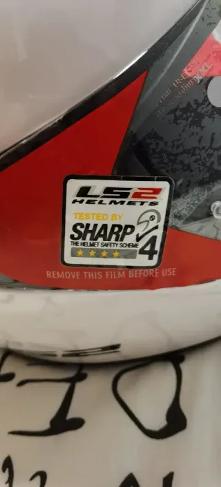 Casco de moto LS2 en color blanco, talla XL. Cuenta con una valoración de 4 estrellas en seguridad SHARP. - Modelo: LS2 - Color: Blanco - Talla: XL - Certificación: SHARP 4 estrellas