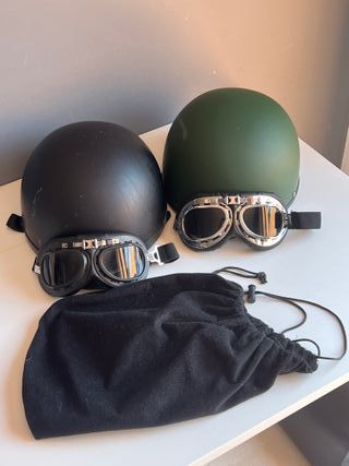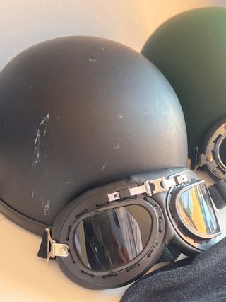 Vendo dos cascos tipo vintage con gafas incluidas: Casco verde (talla S - 55/56 cm): totalmente nuevo, nunca usado. Casco negro (talla XL - 61/62 cm): en buen estado, con signos de uso (ver fotos). Cómodos, con interior acolchado y cierre seguro. Ideales para moto, scooter o decoración. Precio por ambos: 45€ También se venden por separado. Escríbeme para más info o fotos adicionales.