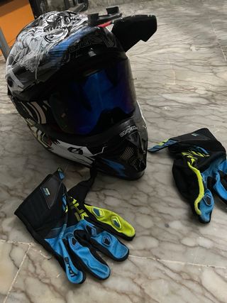 Casco y guantes de motocross en buen estado. Ideales para tus aventuras off-road. - Casco Oneal, diseño llamativo. - Incluye 2 pares de guantes, uno negro y otro azul y verde lima. - Talla del casco y guantes a determinar.