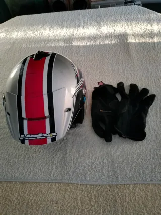 Conjunto de casco de moto y guantes. - Casco plateado con detalles en rojo y negro. NO CONOZCO LA TALLA DEL CASCO PORQUE NO LLEVA LA ETIQUETA EN EL INTERIOR !!!