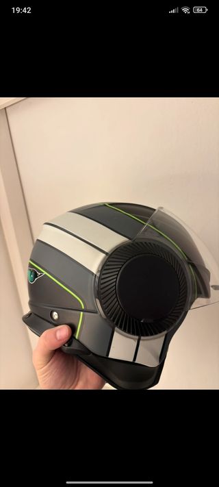 Casco de moto AGV Orbyt con un diseño moderno y líneas deportivas. - Color gris, blanco y detalles en verde lima. - Visera transparente. - talla S
