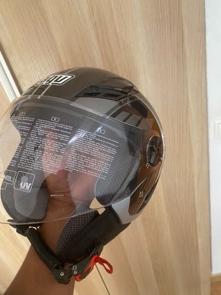 Casco de moto - Color negro mate con detalles grises. - Visor oscuro. - Interior acolchado.