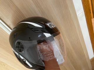 Casco de moto negro con un diseño clásico y una visera para protección. Lo vendo porque me da pena tirarlo y alguien le puede dar uso. Presenta varios defectos de uso pero sigue teniendo una vida útil.