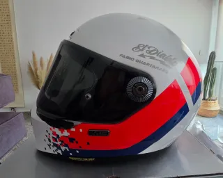 Casco HJC V10 réplica Fabio Quartararo. Talla S (55-56) Cierre doble hebilla. Muy ligero. En perfecto estado. Sólo usado en 2 ocasiones por error en talla. Incluye: - Visera ahumada - Visera transparente - Pinlock - Mentonera - Funda. - Caja original. Estilazo ideal para tu moto Scrambler, café racer o clásica. ¡NO VENDO LA VISERA SOLA! # scrambler # cafe racer # casco retro # casco vintage # Ducati # Triumph # BMW Nine T