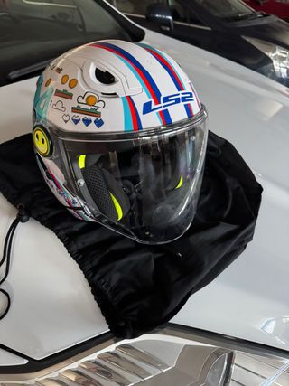 Casco de moto LS2 con un diseño llamativo, ideal para niños. - Talla L, para edades de 7 a 10 años. - Medida de cabeza: 51-52 cm. - Cierre de seguridad.