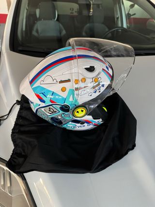 Casco de moto AGV en color negro con detalles en blanco, azul y verde. Incluye funda protectora y visera adicional. TALLA XXL, pero da más como XL - Diseño deportivo. - Marca AGV.