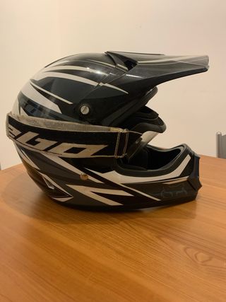 Conjunto de equipamiento para moto de cross o todo terreno. Incluye casco, gafas y guantes. - Casco con diseño deportivo. - Gafas con lente reflectante. - Guantes negros.