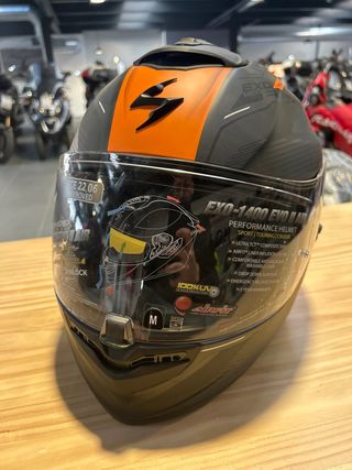 Casco integral Scorpion EXO 1400 EVO 2 AIR en talla M. Diseñado para un ajuste cómodo y seguro. - Calota Ultra TCT® Composite. - Sistema de inflado de almohadillas AIRFIT®. - Interior confortable, antimicrobiano y lavable. - Visera solar retráctil. - Sistema de liberación de emergencia. - Garantía de 5 años.