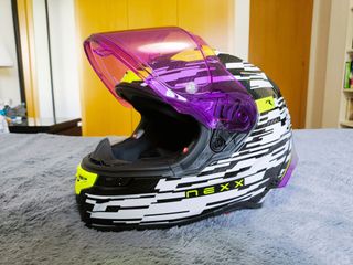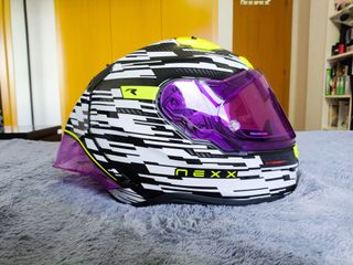 Casco integral de moto Nexx X.R3R decoración Glitch Racer blanco-violeta-blanco-flúor. Calota full fibra de carbono (solo 1400gr en esta talla), gama muy alta. Con alerón racing extendido aerodinámico y cierre doble D imantado. Talla L (59/60) Norma certificado ECE 22-06. Incluye visera violeta y transparente nueva totalmente a estrenar. Incluye Pinlock 120XLT (tope de gama) y funda. Solo 1 uso, muy nuevo, como estrenarlo. Oportunidad, es un casco que llama MUCHO la atención (mucho más que en las fotos).
