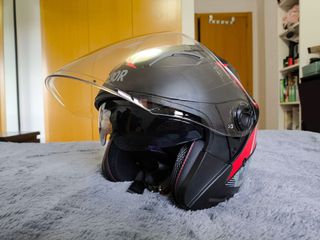 Casco jet de moto Arida 130R V2 negro mate, con visera y gafas solares interiores. Decoración negro mate, gris y rojo. Cierre micrométrico. Interiores extraibles y lavables. Homologación ECE 22.06 Talla XL (60/61) Nuevo, a estrenar. Con caja original y funda. - Diseño aerodinámico. - Interior cómodo. - Cierre de seguridad.