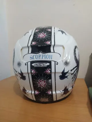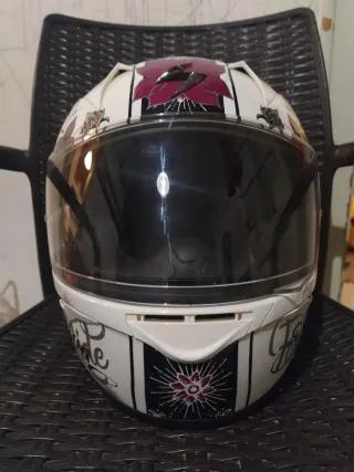 Casco de moto con un diseño llamativo y elegante. - Color base blanco. - Detalles florales en tonos morados y marrones. - Visera oscura. - Cierre de seguridad.