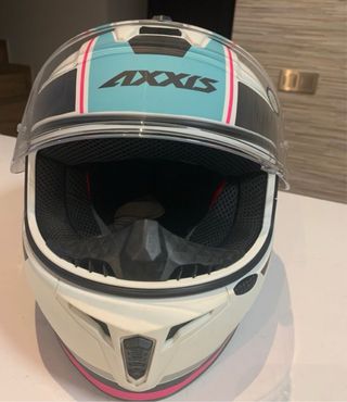 Casco de moto con diseño moderno y llamativo. - Color blanco con detalles en rosa y azul. - Visera transparente. - Marca Sonar y Axxis.