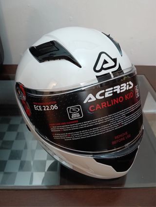 Casco de moto infantil de la marca Acerbis, modelo Carlino Kid. - Homologación ECE 22.06. - Visera resistente a los arañazos. - Diseño blanco con detalles negros y logo de Acerbis.