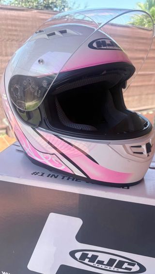 Casco de moto HJC en talla S, con un diseño en color rosa y blanco. - Diseño con detalles en rosa y blanco. - Talla S.