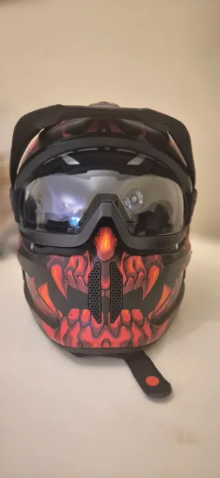 Casco Ruroc para moto de campo con diseño llamativo y gafas incluidas. - Diseño con temática de calavera y fuego. - Incluye gafas de protección.