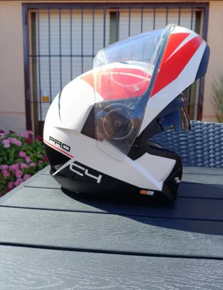 Casco de moto C4 PRO en color blanco con detalles rojos y negros. Visera transparente. - Diseño deportivo. - Cierre de seguridad. - Interior cómodo.