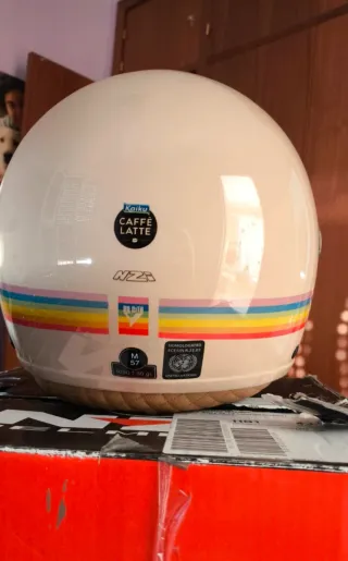 Casco de moto estilo jet, marca NZI, talla M. Presenta un diseño con rayas de colores lgtb en tonos pastel sobre una base clara. - Diseño con rayas de arcoíris. - Visera transparente. - Cierre de seguridad. Lo único que de tenerlo guardado, ya que nunca se ha usado, se le ha desprendido el polipiel de la barbilla. Pero tiene arreglo Me tocó en un concurso de kaiku café