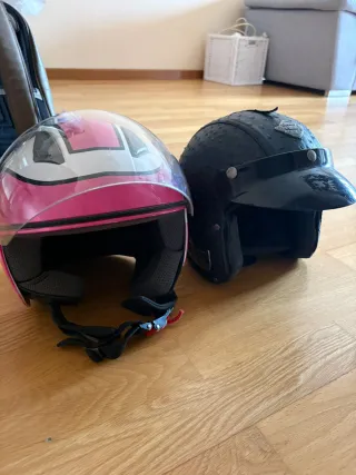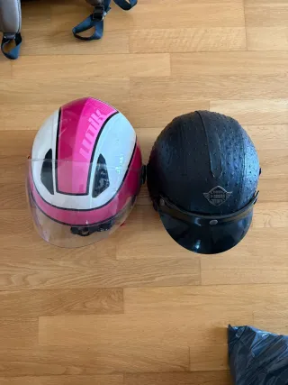 Set de dos cascos de moto, uno rosa con visera transparente y otro negro con visera. - Casco rosa con diseño - Casco negro con textura y visera. - Cierres de seguridad.