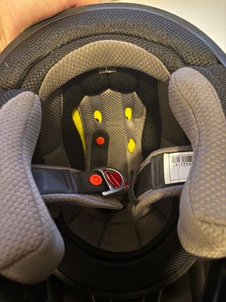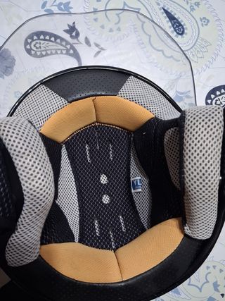 Casco de moto con interior acolchado y correas ajustables. - Color negro. - Acolchado interior. - Cierre de correas.