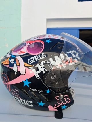 Casco de moto con un divertido diseño. - Estampado con personajes y estrellas. - Detalle de flores y texto femile style. - Visera transparente.