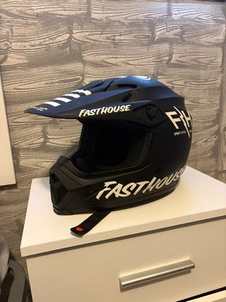 Casco de moto negro con diseño de la marca Fasthouse. Poco uso. - Visera con diseño de rayas blancas. - Logo FH Speed Style en el lateral. Negociable