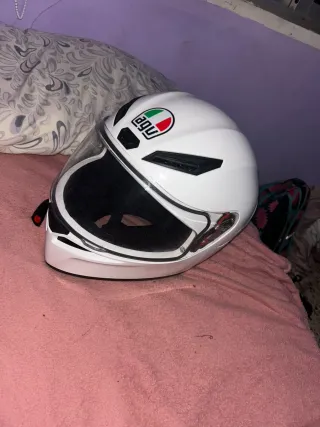 Casco de moto de la marca AGV en color blanco. Diseño deportivo y aerodinámico. - Logo de AGV en la parte superior. - Visera transparente. - Acolchado interior.