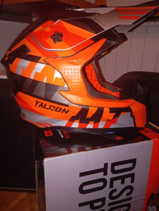 Casco de motocross con un diseño llamativo en naranja y gris.Talla en las fotos subidas,no negociable. - Marca: Falcon - Color: Naranja y gris - Material: Polímero de alta resistencia