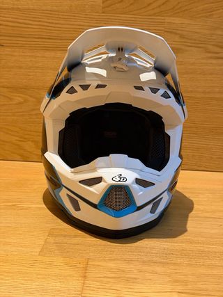 Casco de enduro de la marca Husqvarna, con un diseño llamativo en blanco, azul y amarillo. - Visera aerodinámica. - Interior cómodo. - Cierre de seguridad. Talla M(57/58) Poco usado Material fibra