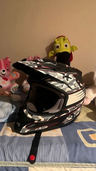 Casco de moto para jóvenes de entre 7 y 15 años. Diseñado para ofrecer protección y comodidad. - Interior acolchado. - Sistema de cierre con correa. - Material resistente. -50 veces de uso aprox
