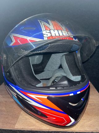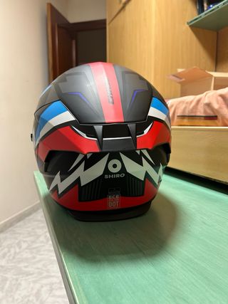 Casco Shiro con un diseño llamativo en colores azul, rojo y negro. Ha sido usado muy pocas veces. - Diseño geométrico. - Visera transparente.