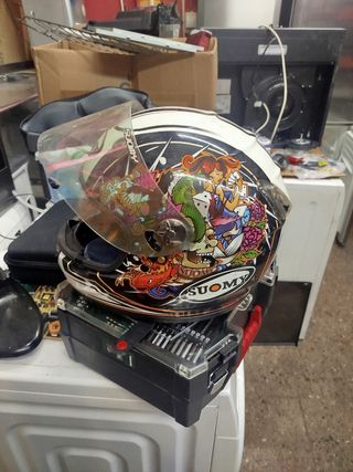 Casco de moto (no se la talla) con la pintura desgastada y unos cuantos rallones pese a eso está en buen estado. No puedo decir mucho de él ya que no tengo ni idea de cascos y lo usaba de decoración.