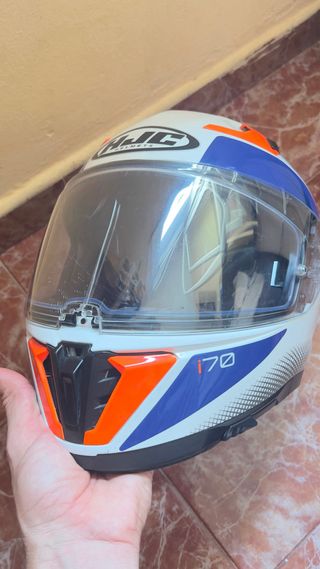Casco de moto integral HJC i70 con diseño deportivo. tiene la visera rota a que cambiarla - Color blanco, azul y naranja. - Visera transparente. - Homologación ECE.