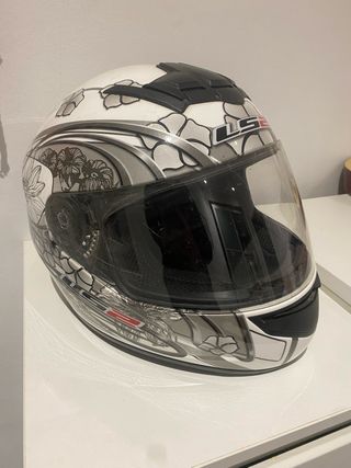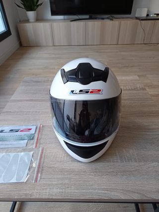 Casco de moto integral de la marca LS2 talla M - Color blanco. - Visera transparente + visera oscura interior. - Diseño deportivo. - Tiene marcas de uso pero mucha vida útil por delante.