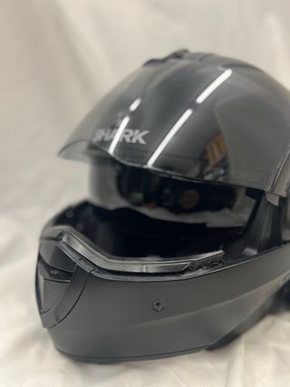 Casco de moto modular de la marca Shark en color negro. - Diseño aerodinámico. - Visera doble - Cierre de seguridad. - convertible en Jet - Pantalla nueva cambiada recientemente. solo la plantalla vale lo que le casco, interior desmontable, talla M-L, le falta un embellecedor lateral, lo podrias encontrar en los recambios de la propia marca y quedaria impecable