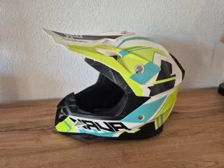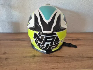 Casco de motocross para niño de la marca Nava. Diseñado para ofrecer protección y comodidad. - Diseño con colores llamativos: blanco, verde lima y azul. - Visera pronunciada para proteger del sol y salpicaduras. - Acolchado interior para un ajuste cómodo.