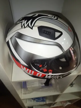 Casco de moto TALLA XL PERO ES EQUIVALENTE A UNA L"❇️ 🪧🪧Muy bien estado en general, por dentro y por fuera. No roturas de NADA!! - Diseño WILD WOLF en blanco, negro y rojo. - Visera transparente. - Correa de sujeción ajustable.