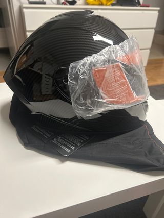 Casco integral con acabado en fibra de carbono y visera transparente. - Con pantalla solar. - Diseño deportivo. - Cierre de seguridad. - Interior cómodo. - Talla L 59-60. - Nuevo a estrenar. - Somos tienda fisica con 2 años de garantia. - Se hacen envios.